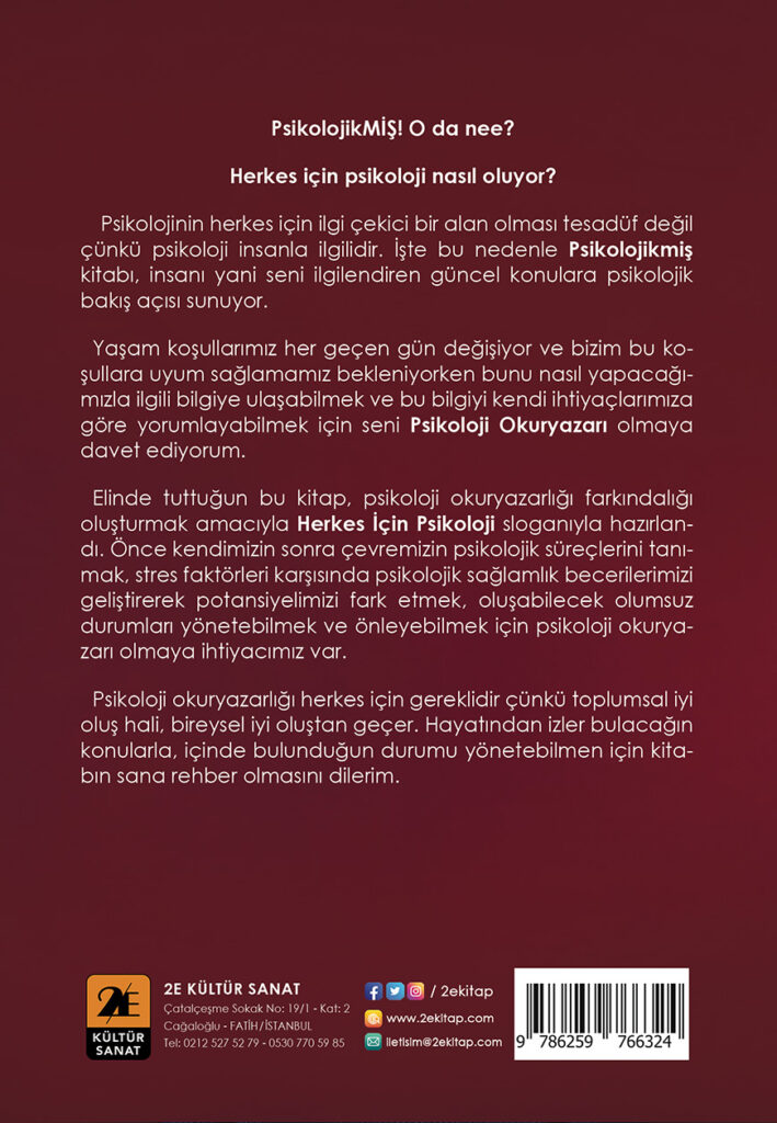 Psikolojinin herkes için ilgi çekici bir alan olması tesadüf değil çünkü psikoloji insanla ilgilidir. İşte bu nedenle Psikolojikmiş kitabı, insanı yani seni ilgilendiren güncel konulara psikolojik bakış açısı sunuyor. Yaşam koşullarımız her geçen gün değişiyor ve bizim bu koşullara uyum sağlamamız bekleniyorken bunu nasıl yapacağımızla ilgili bilgiye ulaşabilmek ve bu bilgiyi kendi ihtiyaçlarımıza göre yorumlayabilmek için seni Psikoloji Okuryazarı olmaya davet ediyorum.